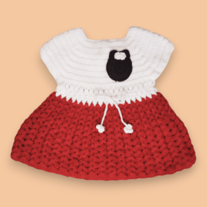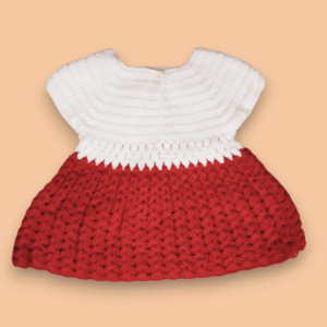 handcrafted by empowered women. Crochet lovely frock set . Includes red and white color frock with a matching cap and shoes. Premium quality wool is soft, cozy and does not fade or lose its shape. Hand wash or dry clean for best results.